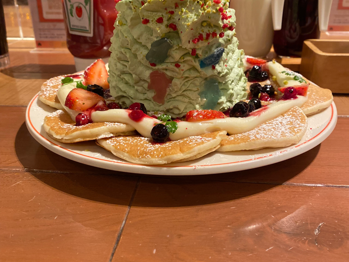 エッグスシングス、クリスマスメニューが登場しました。 クリスマスツリーをイメージしたホイップクリームは、 ピスタチオ味。グミのオーナメントが付いています。 パンケーキにかかった、ミルクシロップ?は余分だな。。。 甘すぎる。 ハッシュドビーフ